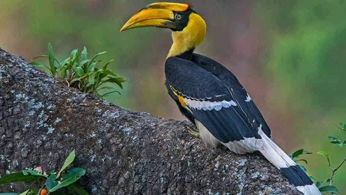 Hornbills, with their curved bills and dramatic flight, play a crucial role in dispersing seeds of large native trees.